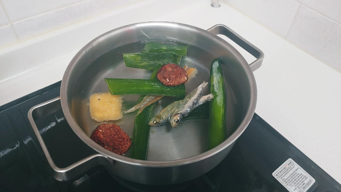 냄비가득 물을 붓고 파, 말린표고버섯, 황태, 디포리, 다진마늘을 넣고 국물을 우려줍니다. 디포리는 물이 끓으면 5분 뒤에 건져 줘야 합니다. 안그럼 좀 비린내가 날 수도 있다고 하더라구요. 그래서 저는 항상 물이 끓고 5분후에 건져 내려고 합니다. 육수는 뭐 어렵지 않죠? 자투리 채소들 모아뒀다가 우려도 되니까 꼭 해보세요. 그냥 다시다 넣고 끓인거랑은 정말 차원이 다른 정성스러운 맛이 납니다.
