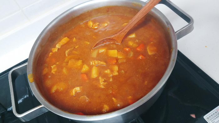 이제 카루가루를 넣고 잘 섞어줍니다. 카레 가루가 생각보다 많더라구요. 이 때 맛을 보시고 조금 짜다 싶으시면 물을 더 넣어주세요. 카레가루를 넣어주니까 금방 걸죽해지더라구요. 이제 우리가 아는 익숙한 카레향이 나기 시작합니다. 저는 고기에 카레가 쏙 베이도록 물을 넉넉하게 넣어주고 약한 불로 뭉근하게 끓여줬어요. 급하신 분들은 빨리 끓여서 드셔도 됩니다.