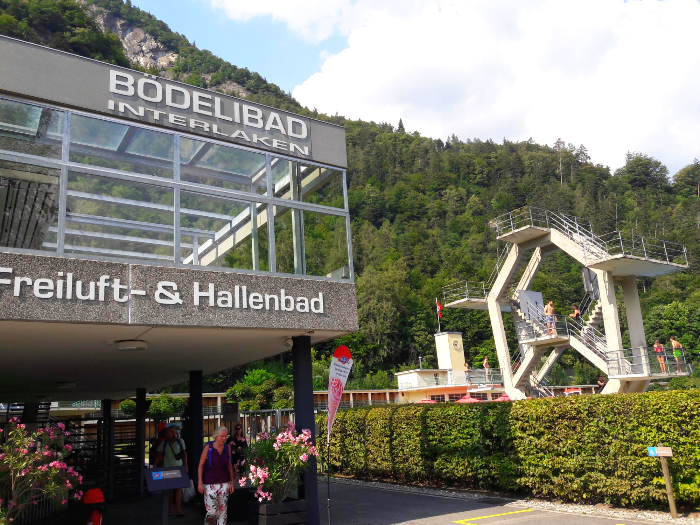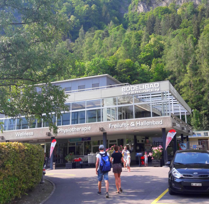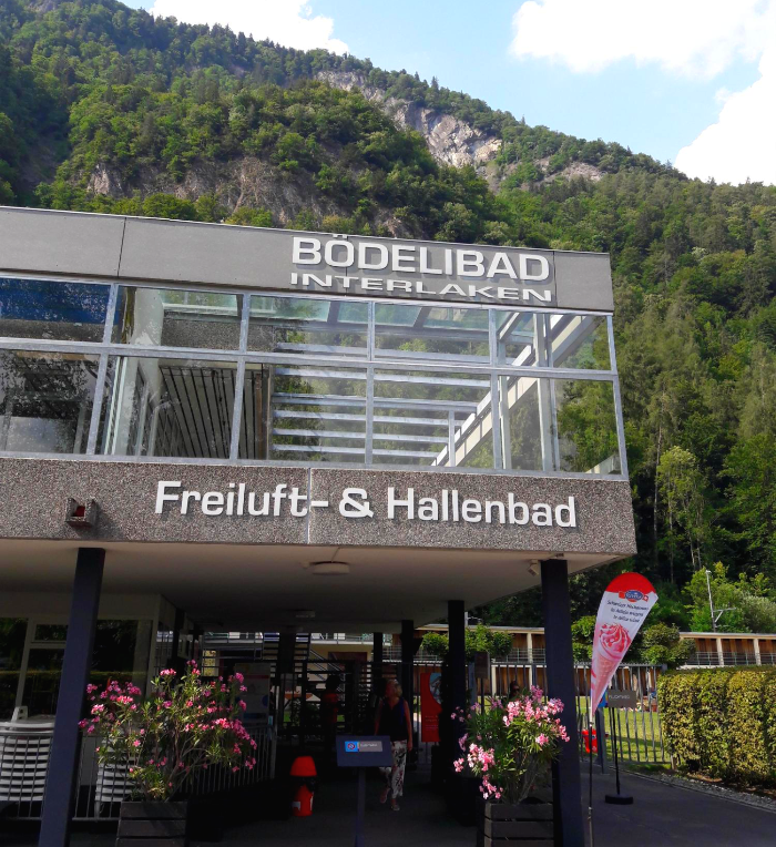 인터라켄의 야외수영장 보델리바드의 위치는 인터라켄 메인 거리에서 왼쪽으로 15분정도 걸어가시면 쉽게 찾으실 수 있습니다. 걸어가다 보면 큰 주차장이 나오고 그곳을 지나면 강이 나오는데 강을 따라 올라가면 강을 건널 수 있는 다리가 나옵니다. 그 다리를 건너면 BODELIBAD INTERLAKEN이라고 쉽게 찾으실 수 있어요.