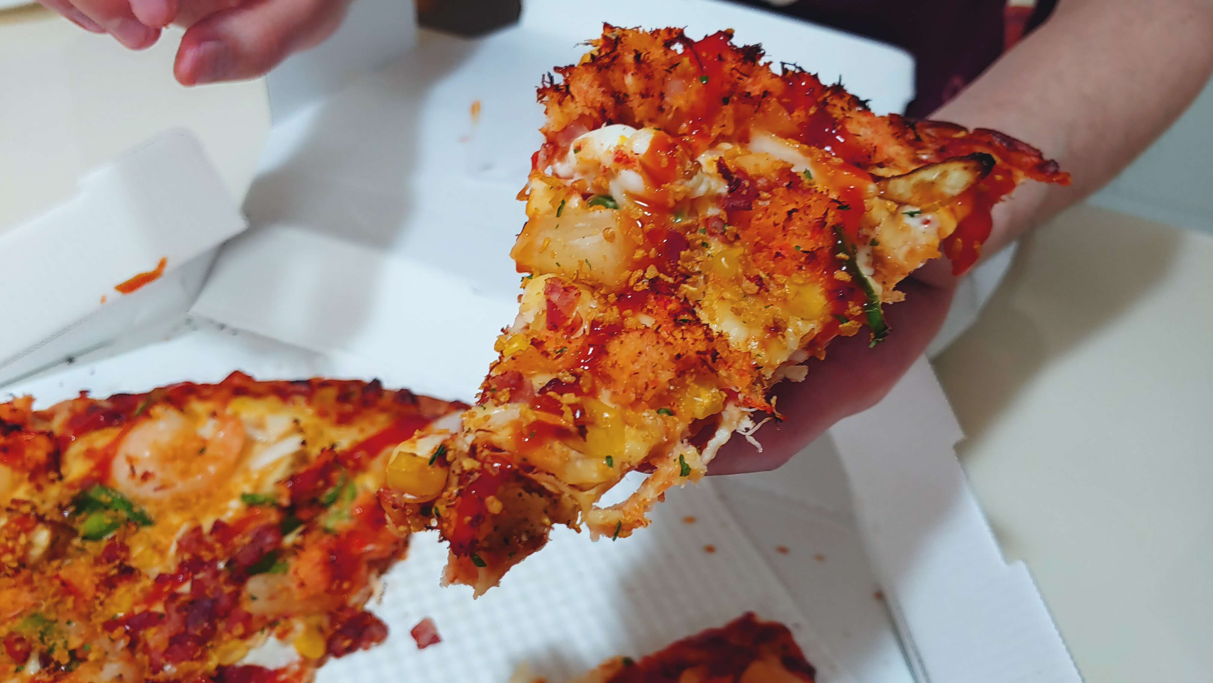 와,,, 저 혜자로운 토핑 좀 보십시요! 도미노 진정 최고아닙니까? 씬도우에 저렇게 혜자로운 토핑은 정말 환상의 궁합입니다. 아!! 가장 중요한 맛 후기! 여러분~ 지금부터 제 이야기 잘 들으세요. 아셨죠? 혹시 지금 도미노 피자를 주문하실 분들이 후기가 궁금해서 들어와 보셨다면? 주저마시고 시리얼칠리크랩 주문하세요!!! 빨리 주문하세요!!! 1분 2분 지날수록 내가 피자를 받는 시간은 10분 20분 딜레이 됩니다.