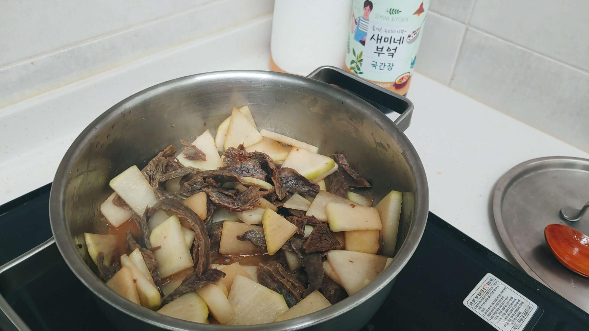 소고기가 어느정도 익으면 육수를 부어주세요. 저는 국간장으로 무우에 간을해서 국물색이 조금 진하게 보이네요. 그래도 저는 국간장으로 간을 하는게 좋더라구요. 조금 더 깊은 맛이 느껴진다고나 할까요? 하지만 깔끔한 맛을 원하시는 분들은 소금으로 간하세요!