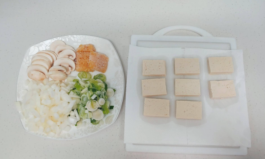 저는 두부 반모가 남아서 어떤 반찬을 해 먹을까 하다가 두부조림을 해 먹어야 겠다고 생각해서 두부를 잘라서 키친타월에 물기를 제거해서 준비했습니다. 물기를 뺄때 소금을 위에 솔솔 뿌려두면 두부가 더 단단해진다고 합니다.