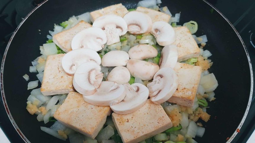 두부와 양송이 버섯을 그 위에 올려주세요.
