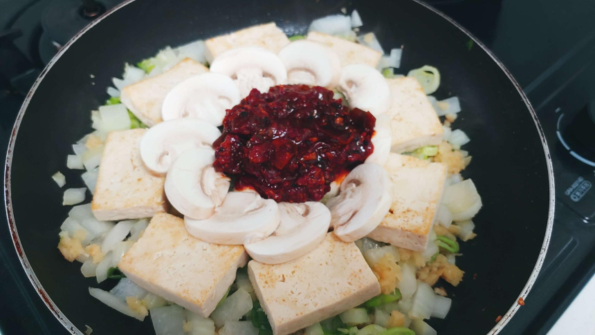 양파가 대충 익었다면 미리 부쳐둔 두부를 가지런히 올려줍니다. 양파는 꼭 다 익히지 않아도 됩니다. 어차피 물을 붓고 조릴거라서 괜찮아요! 양송이 버섯도 가지런히 올려 줍니다. 사실 원래는 요리할 때 버섯은 마지막에 넣거든요~ 오늘은 예뻐보이려고 미리 넣었답니다. 미리 넣으셔도 맛있는데 가급적이면 마지막에 넣는 것을 추천드립니다.