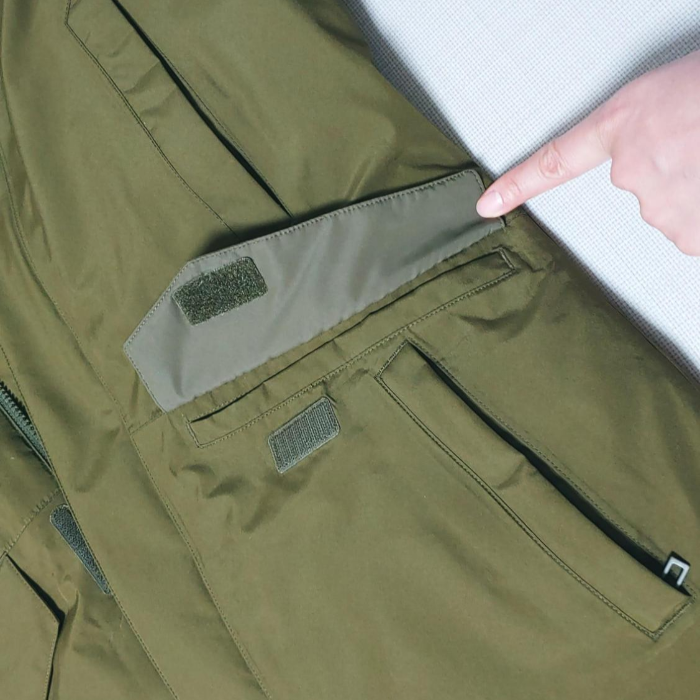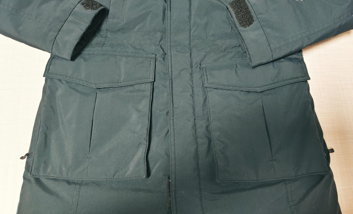 하이로프트원단이 주머니와 목둘레를 감싸고 있습니다.