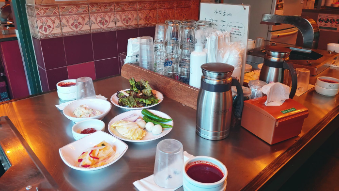 밑반찬과 소스가 세팅되어 있어요.