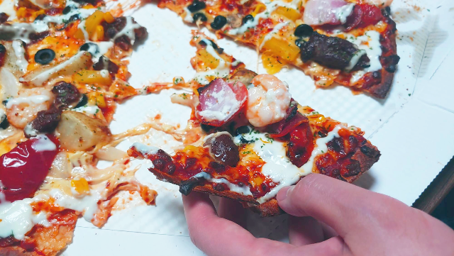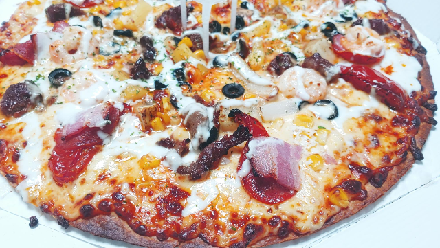 사진에서 잘 표현이 되었나 모르겠는데 진짜 피자 도우에 꽉~~~~차게 토핑을 올려주었습니다. 게다가 인기있는 10위의 토핑이 곳곳에 있기 때문에 한 입 한 입 먹을 때마다 맛이 달라요. 피자 한판에 정말 다양한 맛이 느껴집니다. 새우도 진짜 통통하고 베이컨+토마토는 진짜 최고의 궁합이었습니다.