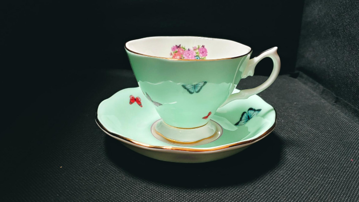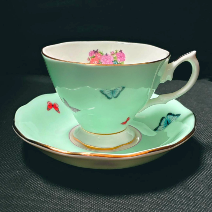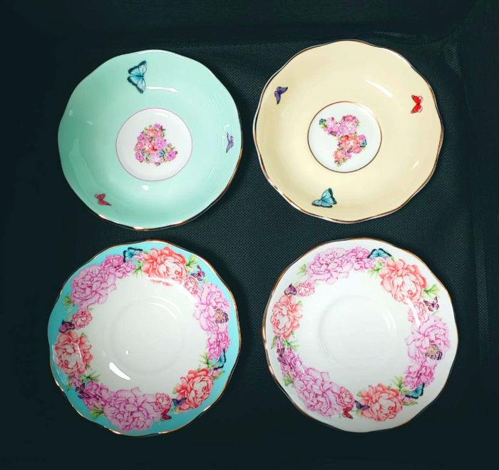 테두리에 금장으로 둘러저 있어서 찻잔이 한 층 더 고급스러워 보인답니다. 그리고 소서( 접시 ) 보시면 굴곡 보이세요? 그냥 원형이 아니라 약간씩 굴곡이 저 있어요. 그래서 꽃을 모티브로 한 디자인이 더 빛을 발한답니다. 손잡이는 나비의 날개를 본떠서 만든 것 같이 예쁘죠?